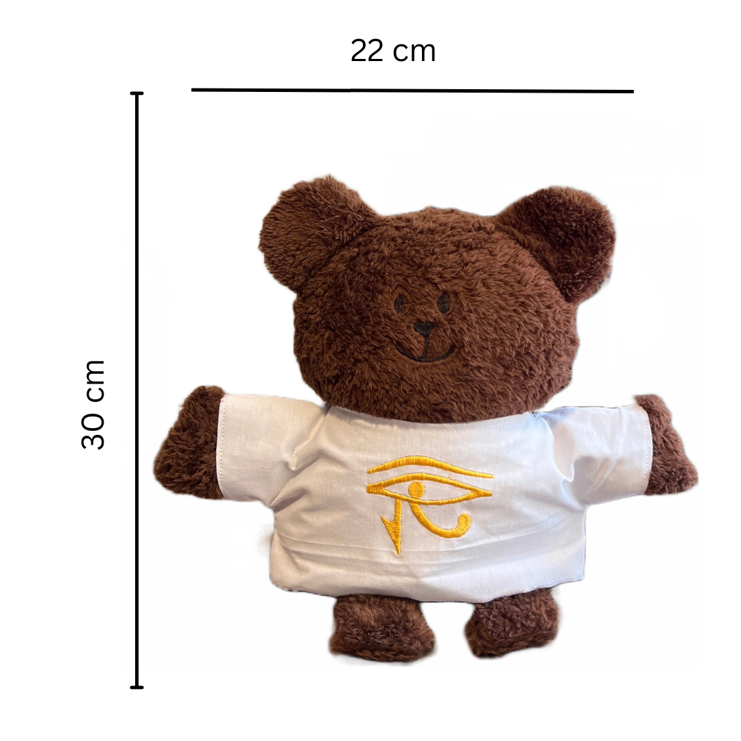 30 cm eco-friendly Two playful Horus bears, one white and the other a rich brown. bask in the glory of the ancient Egyptian sun. Their matching t-shirts, adorned with the captivating Horus eye, representing protection, health, and restoration.