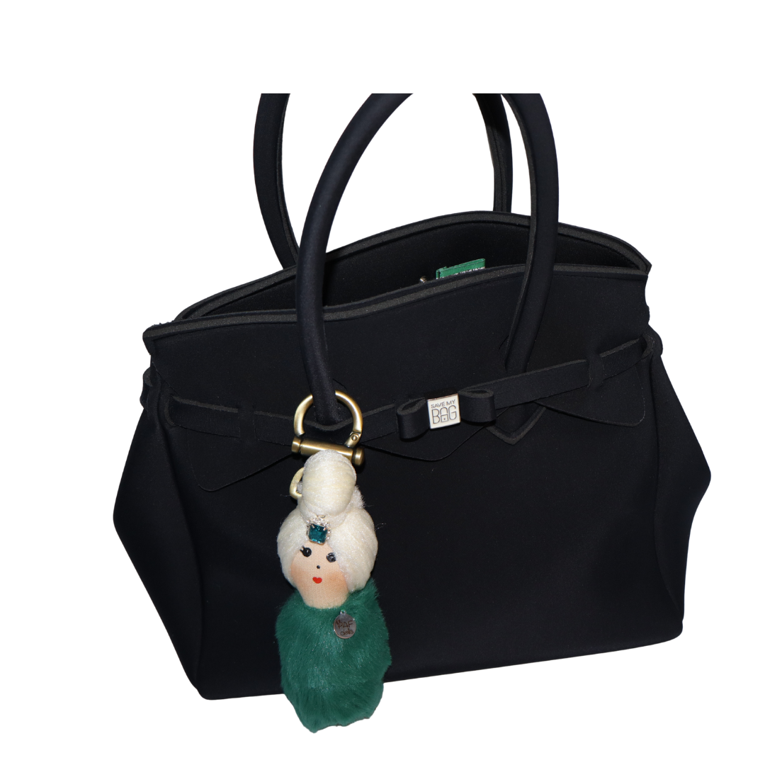 Add a touch of elegance and playfulness to your handbag with this handcrafted eco-friendly bag charm. Featuring a doll adorned with a jeweled headpiece and soft emerald fur, it blends heritage, style, and personality in one chic accessory.