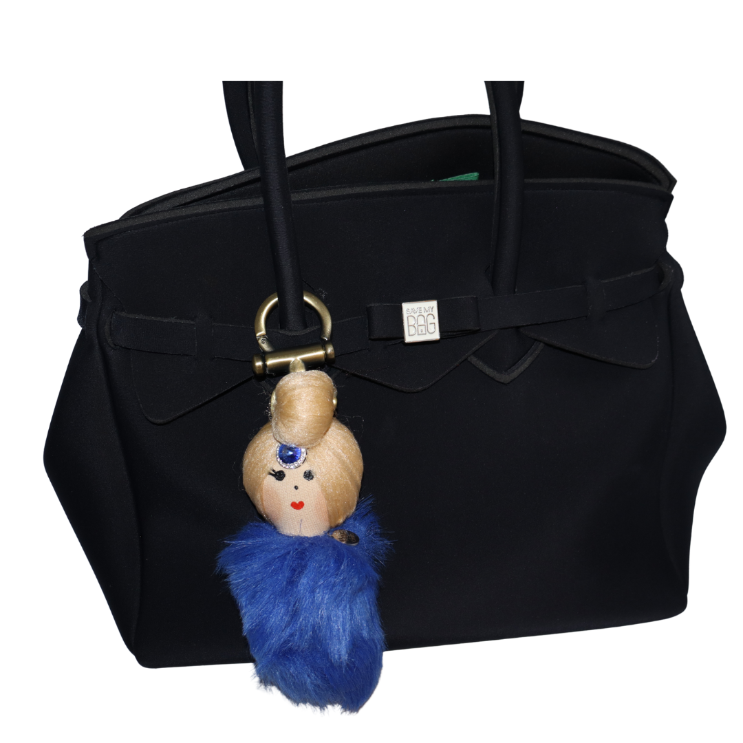 Elevate your style with this handcrafted eco-friendly bag charm, featuring a doll adorned with a sapphire-like jewel and soft blue fur & gold hair. A chic blend of heritage and fashion, it’s the perfect accessory to add personality and elegance to your handbag.