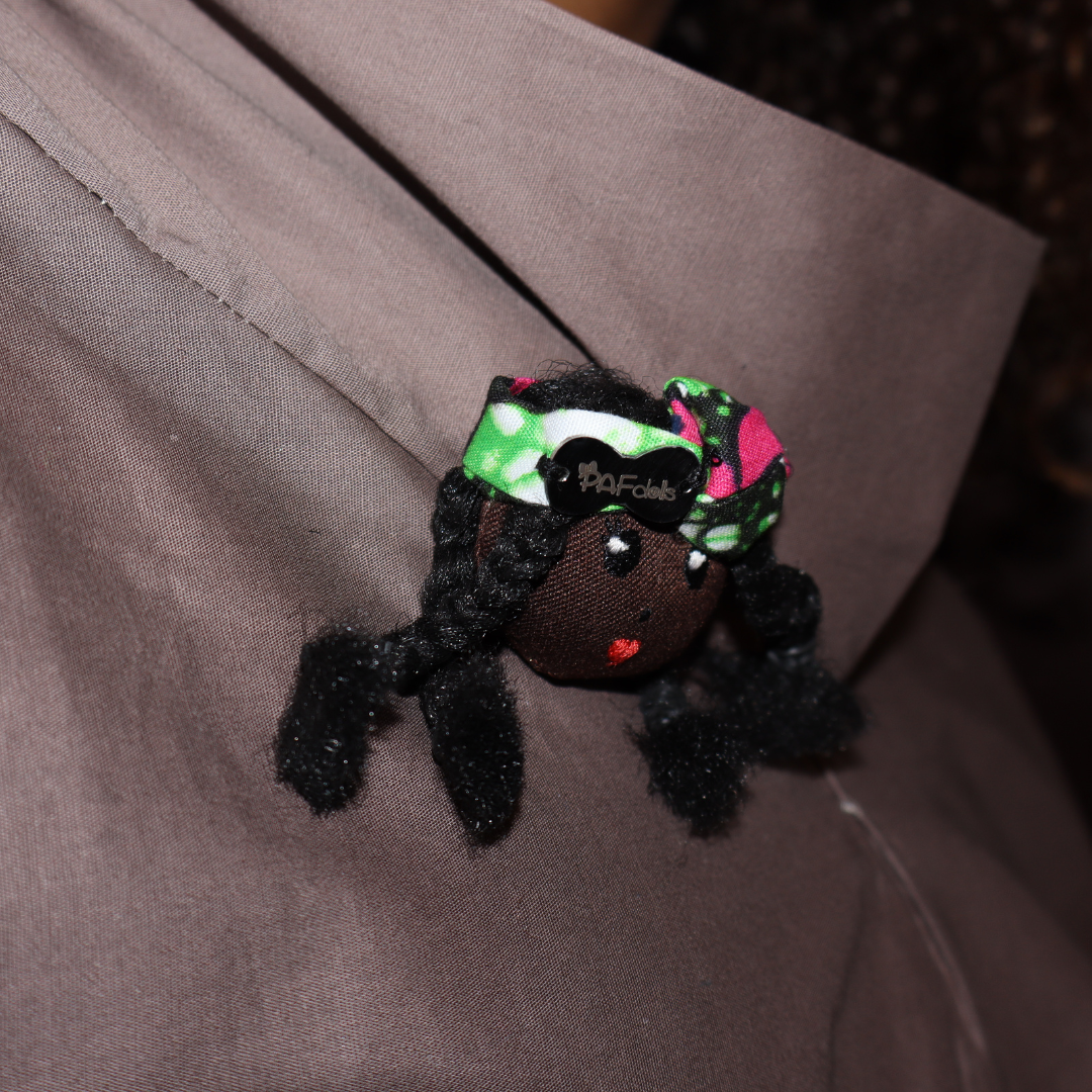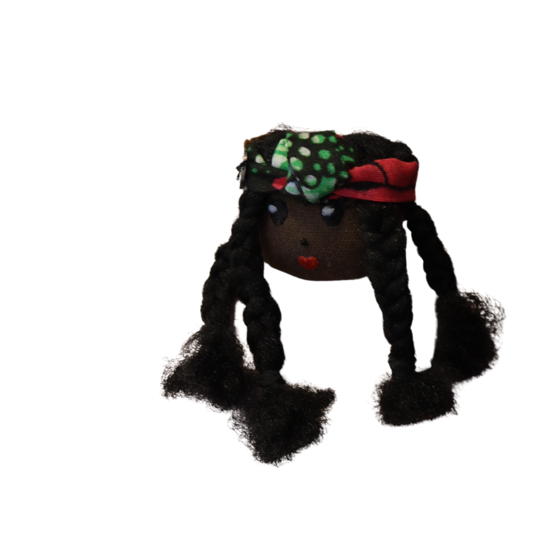 This handmade brooch features a doll face with long braided black hair, styled with a colorful fabric headwrap in red, green, and polka-dot patterns. With her bold red lips and expressive eyes, this pin adds a vibrant, cultural, and playful touch to any outfit—perfect for jackets, dresses, or scarves.
